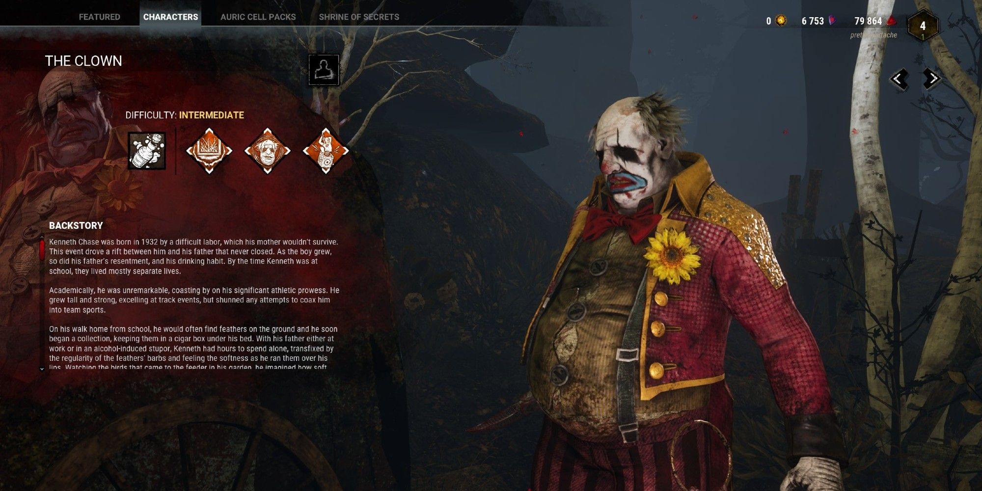 In addition to the many licensed crossover characters from horror media, Dead By Daylight has a comprehensive roster of terrifying original Killers to master. The Clown is one of the earliest characters to be added to Dead By Daylight, available alone in the in-game Store or with Survivor Kate Denson in the Curtain Call DLC chapter. Kenneth Chase, later known as Jeffrey Hawk, got his start as a sadistic killer in the 1930s by trapping and harming small animals, often keeping parts of them as trophies. Eventually, he began drugging and murdering people, experimenting with different chemicals to create the perfect anesthetic to aid him in his crimes. As a Killer, The Clown can throw bottles of his perfected Afterpiece Tonic to intoxicate and hinder Survivors or invigorate himself. He can also strike with Madame Butterfly, an oversized Butterfly Knife, as a Basic Attack. The Clown's major draw as a Killer is his ability to control the Trial and hinder Survivor movement.