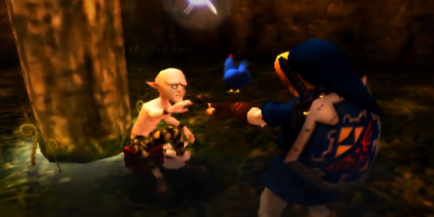 In a more depressing part of Ocarina Of Time, Link can meet a skinny man named Grog who resembles Gollum from the Middle-Earth franchise. He's sad and angry, despises his family, and even those around him. Link manages to make him somewhat happy by retrieving his pet blue Cucco for him.