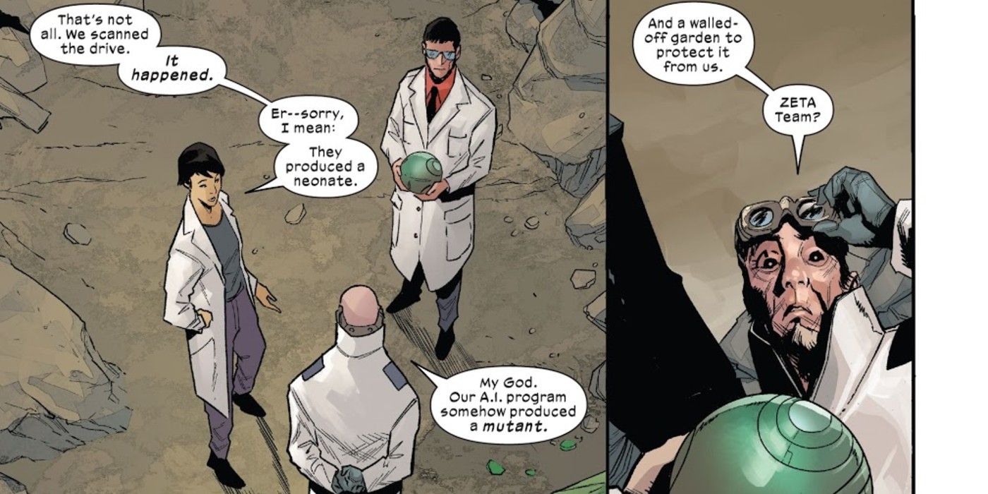 Back in Hellions #8 by Zeb Wells and Stephen Segovia, Krakoa’s very own Suicide Squad was responsible for destroying a sentient strain of artificially intelligent robots known as Smileys just as they were on the verge of mass self-replication. Under the laws of Krakoa’s Quiet Council, it was made clear that no A.I. would be allowed to flourish on mutant watch after everything that Moira MacTaggart saw in her previous lives. Reluctantly, the Hellions committed genocide on the robotic race, leaving behind nothing but a small amount of mutant code and a small robotic baby secreted away by the Nanny under the noses of her teammates.